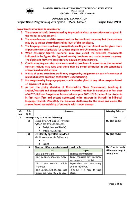 Read Online Model Answer For Summer 12 Examination 12232 Epub
